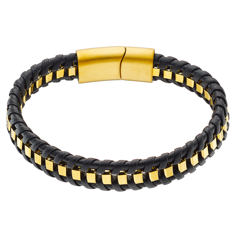 Βραχιόλι με μαύρο δέρμα πλεχτό και επίχρυσο μέταλλο, ατσάλι 316L
